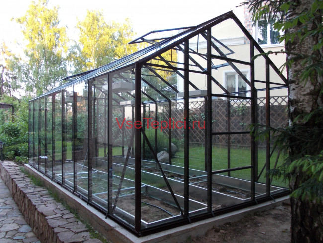 - Скат крыши имеет резкий угол наклона, предоставляя оптимальное место для высокорослых растений внутри теплицы.