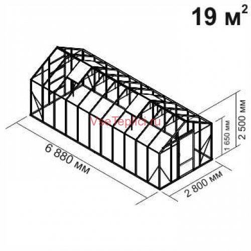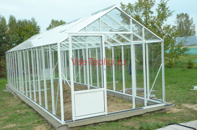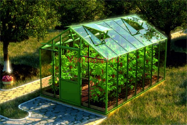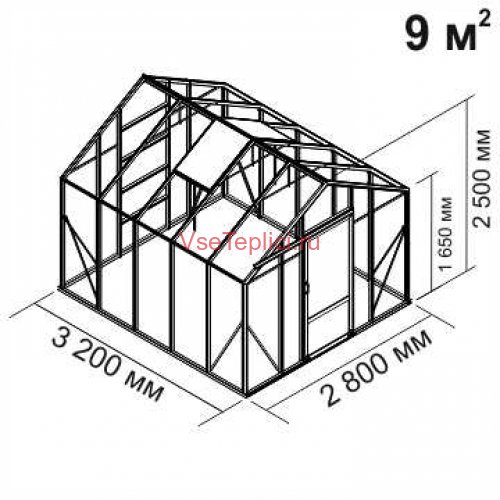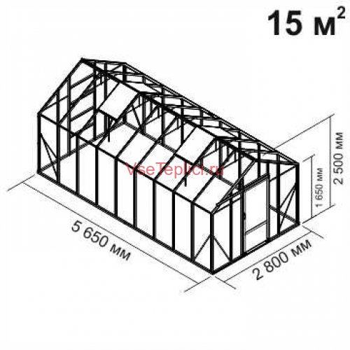 - Скат крыши имеет большой острый угол, что обеспечивает удобное пространство для высоких тепличных растений.